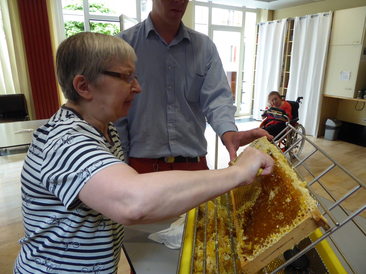 Un moment clé a été l’activité autour des ruches et du miel. En juin, nous avons fait une première récolte. Les résidants ont pu s’essayés à l’extraction du miel. Les mains collantes…nous avons eu le droit de se lécher les doigts, quelle joie!