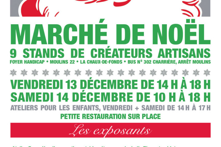 Ne manquez pas de nous rendre visite à l’occasion de notre prochain Marché de Noël de Foyer Handicap La Chaux-de-Fonds. Informations complémentaires: Vendredi 13 décembre, de 14h à 18h Samedi 14 décembre, de 10h à 18h 9 stands de créateurs artisans Ateliers pour les enfants le vendredi + samedi de 14h à 17h Petite restauration...