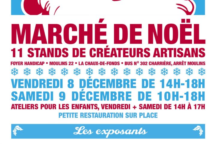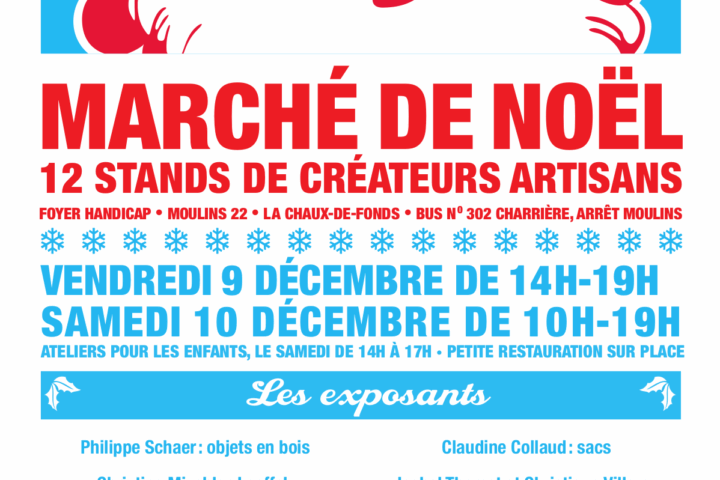 Ne manquez pas de nous rendre visite à l’occasion de notre prochain Marché de Noël de Foyer Handicap La Chaux-de-Fonds. Informations complémentaires: Vendredi 9 décembre, de 14h à 19h Samedi 10 décembre, de 10h à 19h 12 stands de créateurs artisans Ateliers pour les enfants le samedi de 14h à 17h Petite restauration sur place...